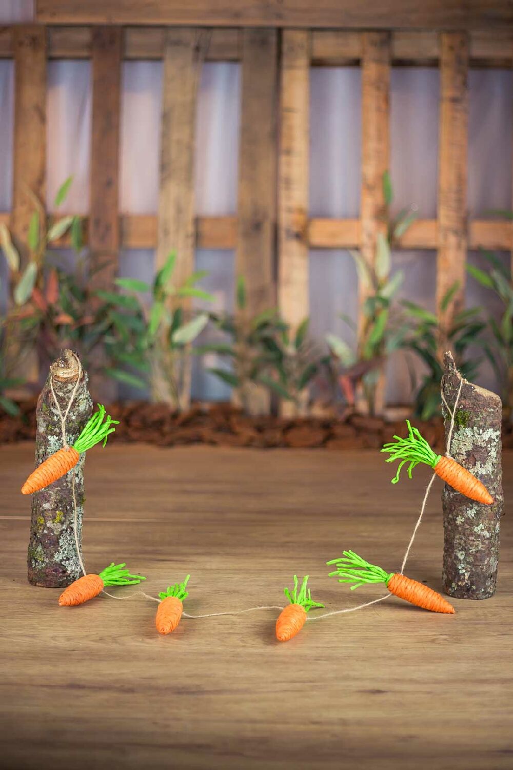 O festão contém 6 cenouras penduradas em fio de juta, possui 100cm, é ideal para a sua decoração de páscoa.
