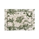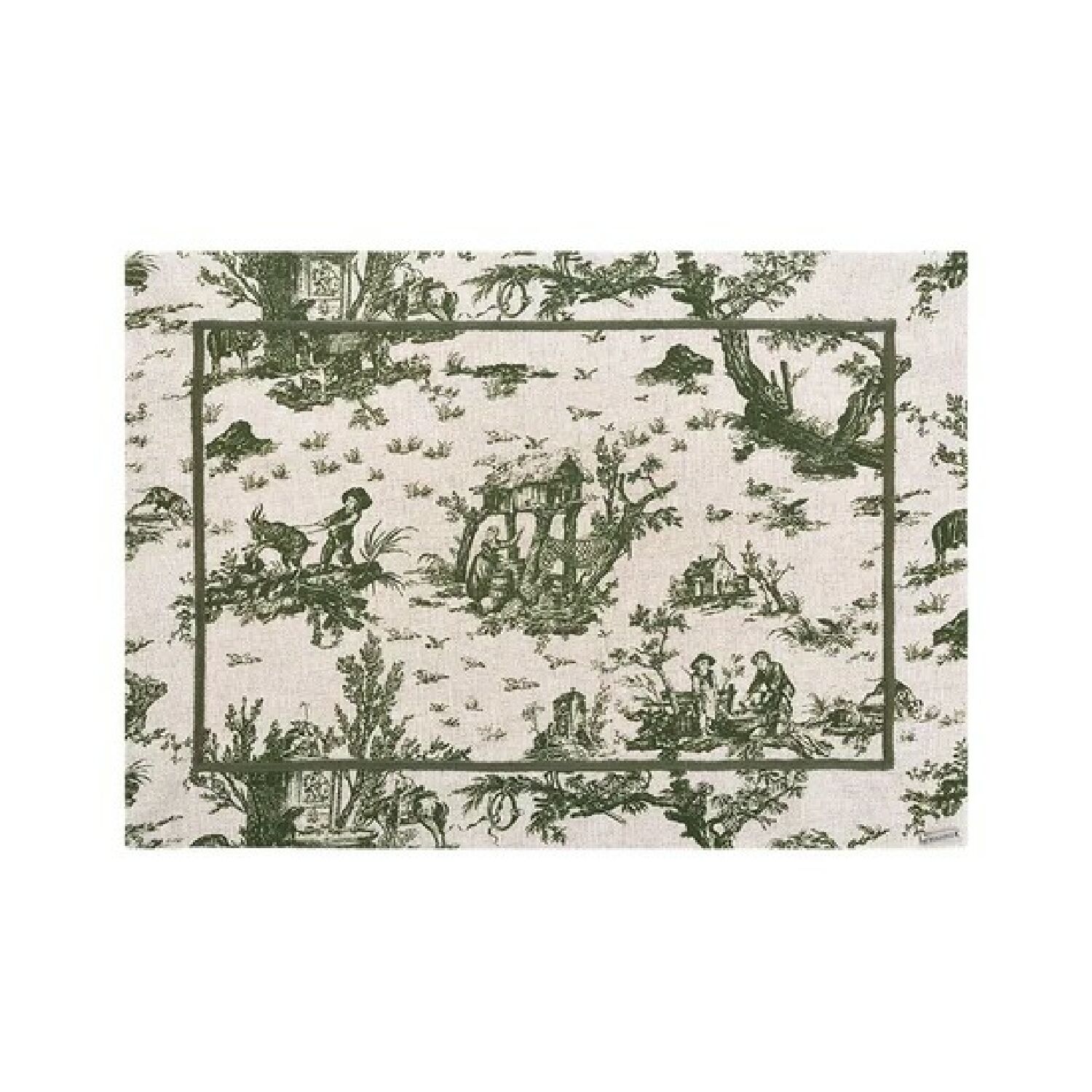 O jogo americano é em tecido linho, na estampa toile oliva, possui bordado por todo contorno da peça.