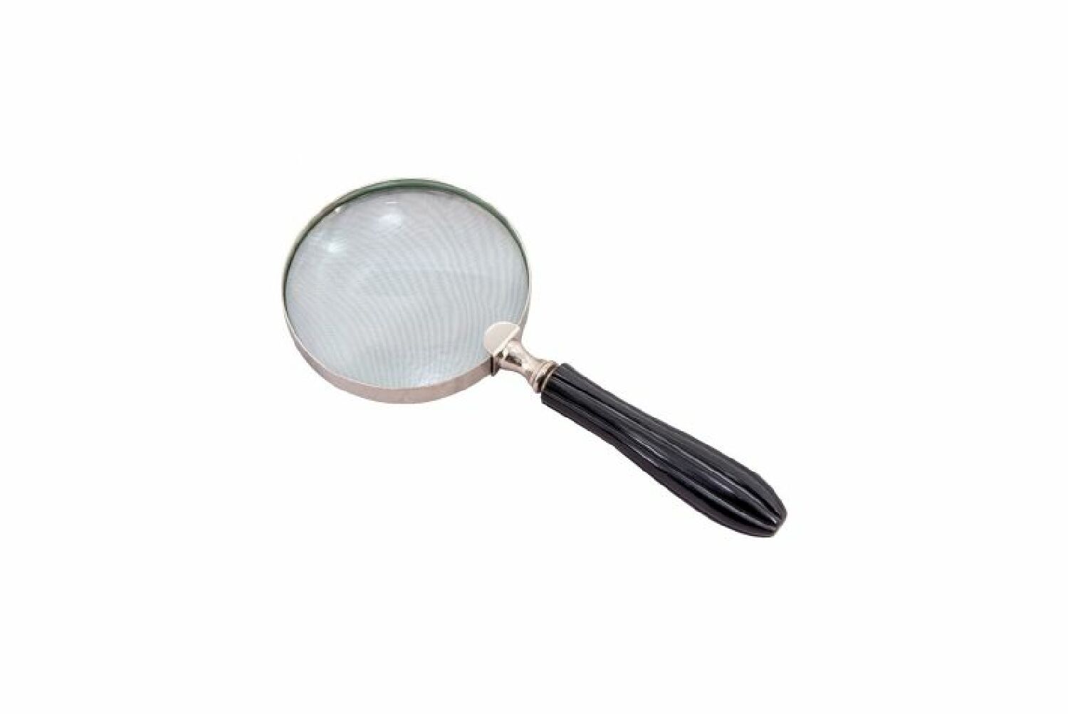 A lupa é em metal e vidro, é um objeto que serve tanto para a função de imagens ampliadas, como um objeto na sua decoração, sento usada em escritórios, em cima de livros.