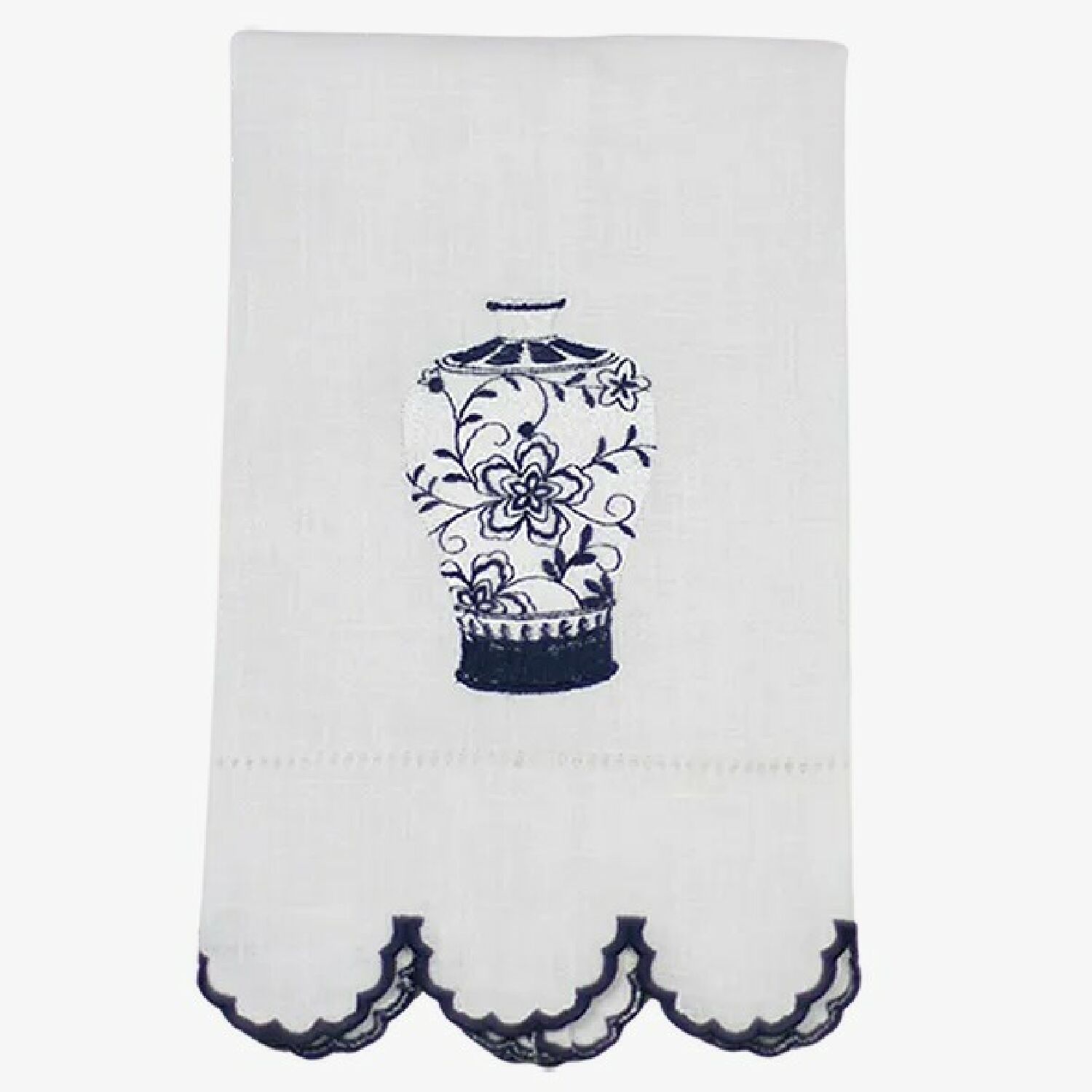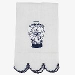 A toalha de lavabo é em linho ca cor branco com estampa chinoiserie.