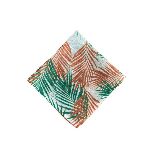 O guardanapo é de linho off com estampa de folhas verdes/laranjas.