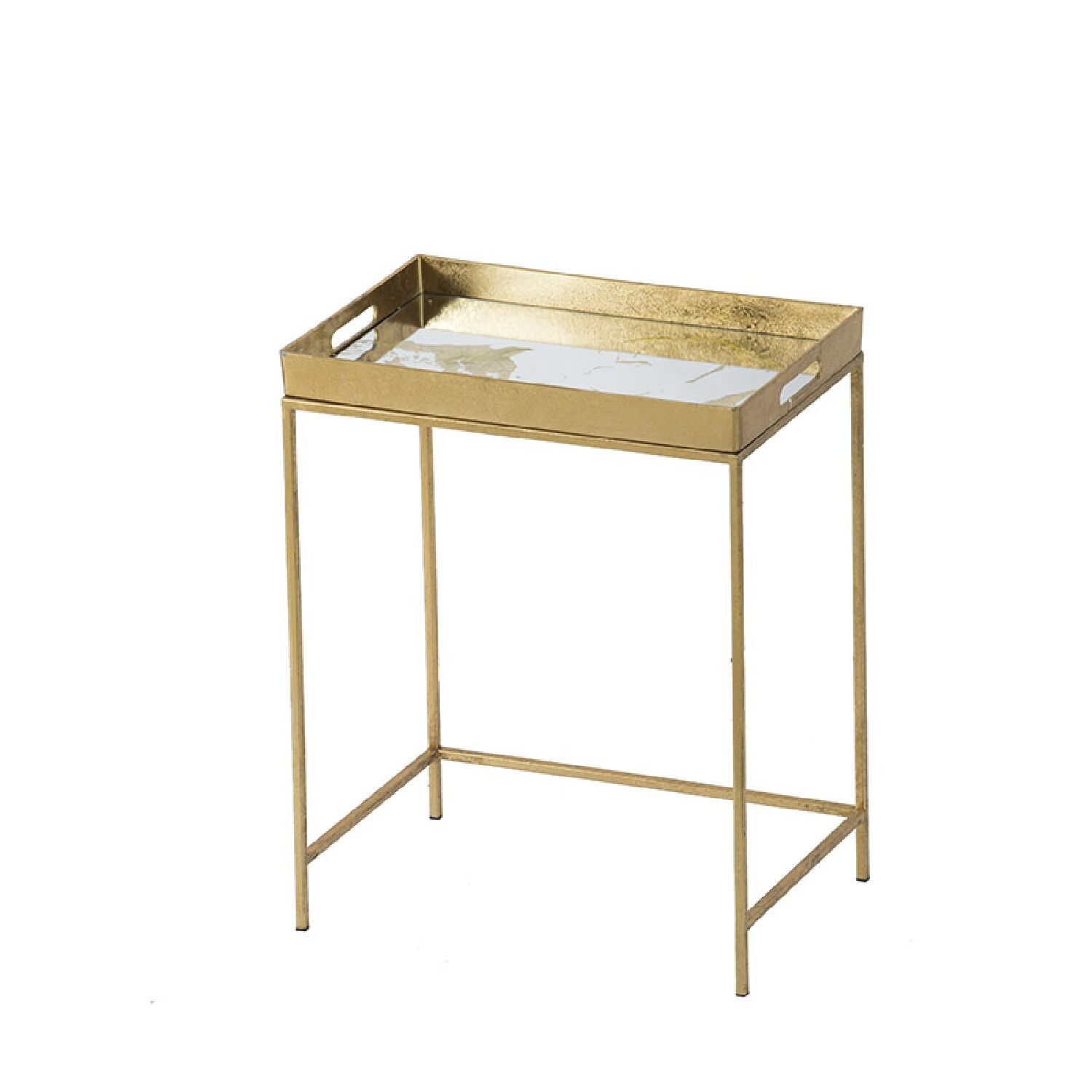 A mesa tray é em metal dourado com espelho que possui detalhes também em dourado.