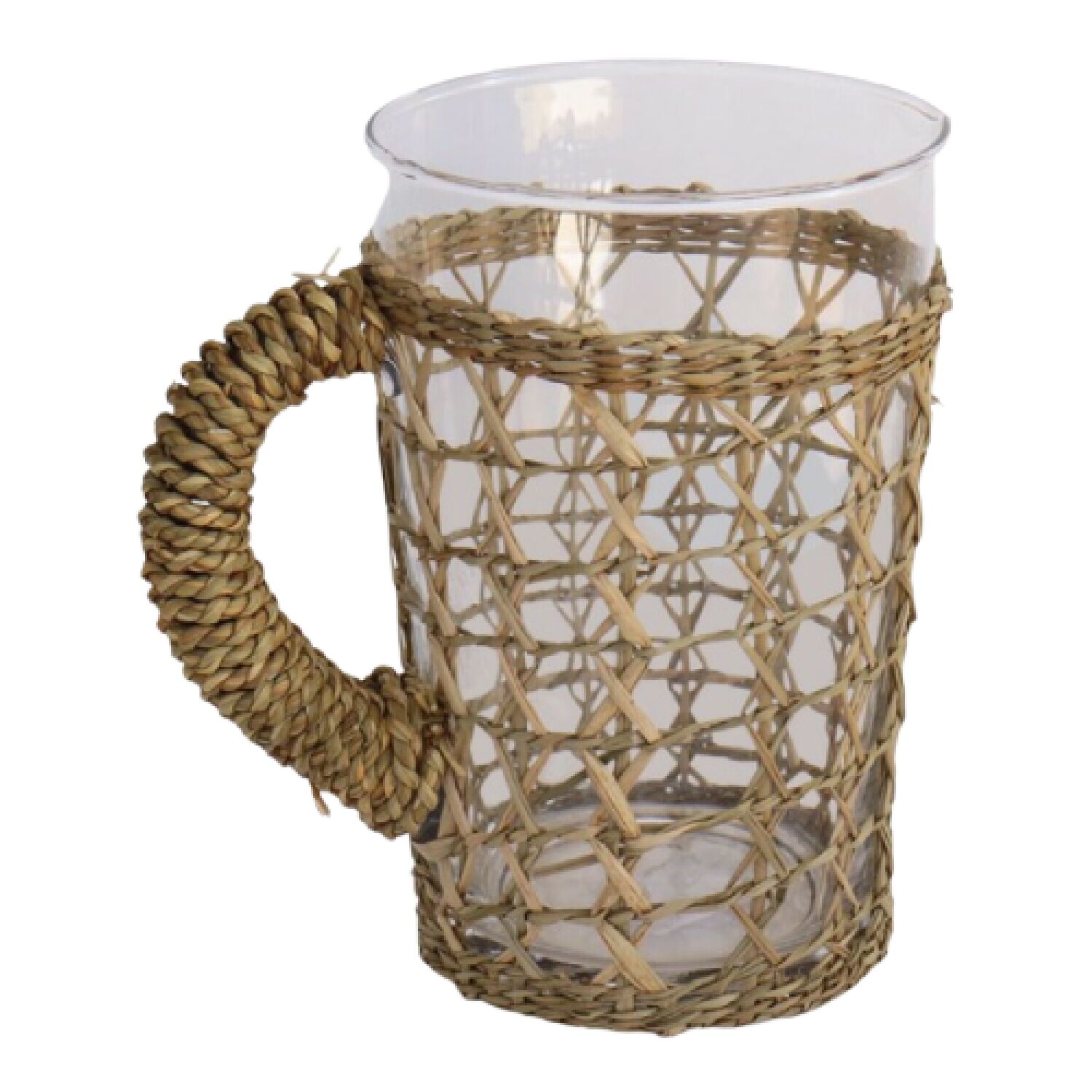 A jarra é produzida em vidro com detalhes em fibra natural.