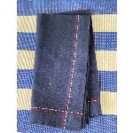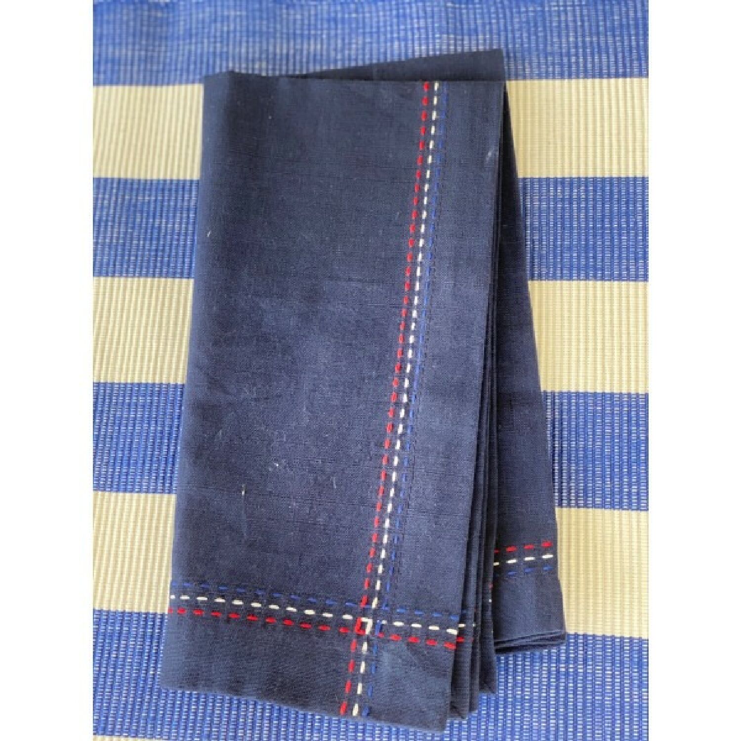 O guardanapo é produzido em tecido 100% algodão na cor azur com detalhe em vermelho em branco.