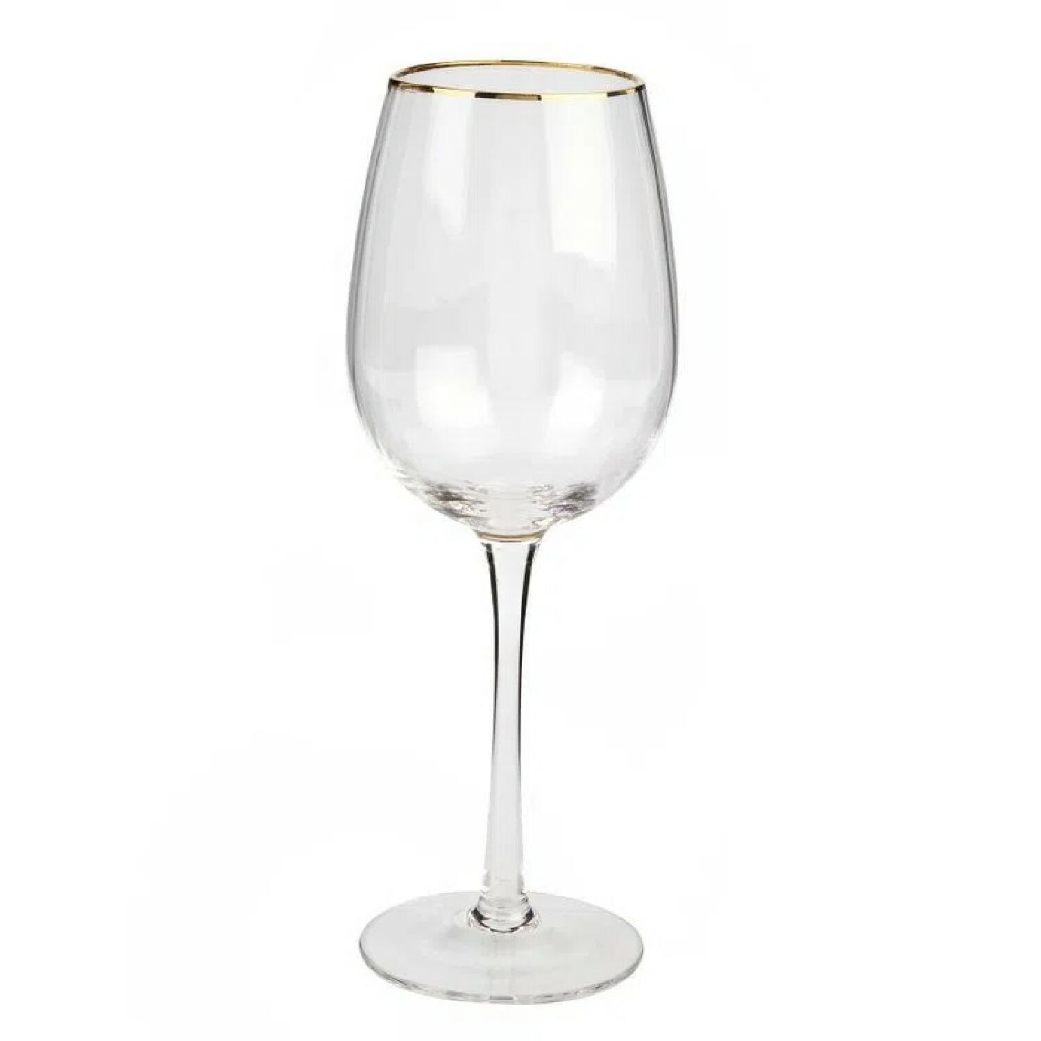 A taça é de vidro transparente com detalhe em dourado na borda.