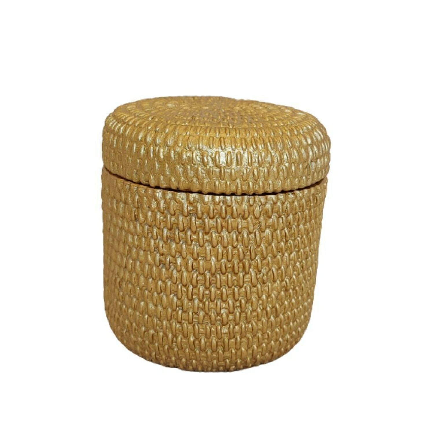 O pote redondo é em resina na cor dourada.