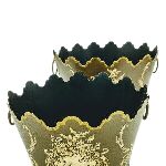 O conjunto de cachepots é em metal na cor marrom com detalhes em bege.