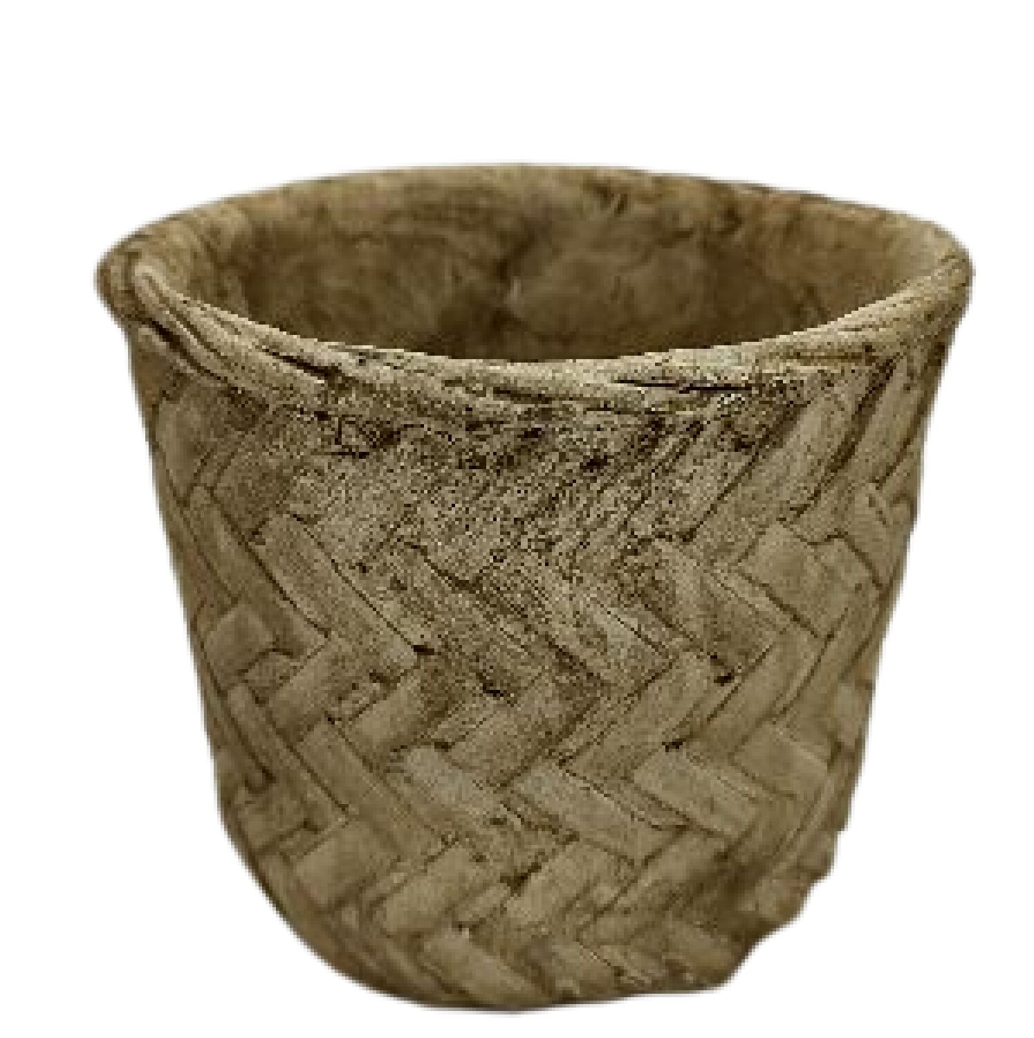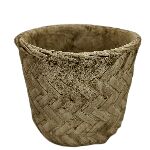 O vaso trancado é em cimento revestido em palha na cor bege.