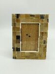 O porta retrato é de vidro revestido em madeira com detalhes em chifre, mesclado nas cores bege e marrom.