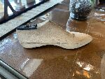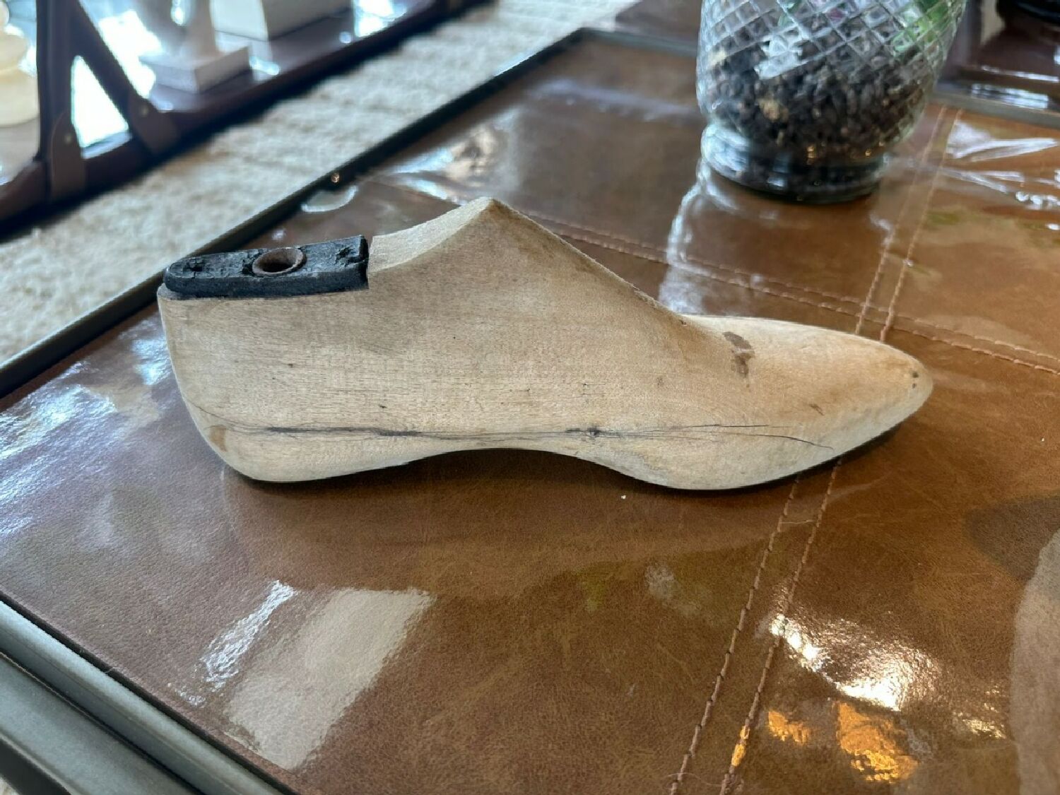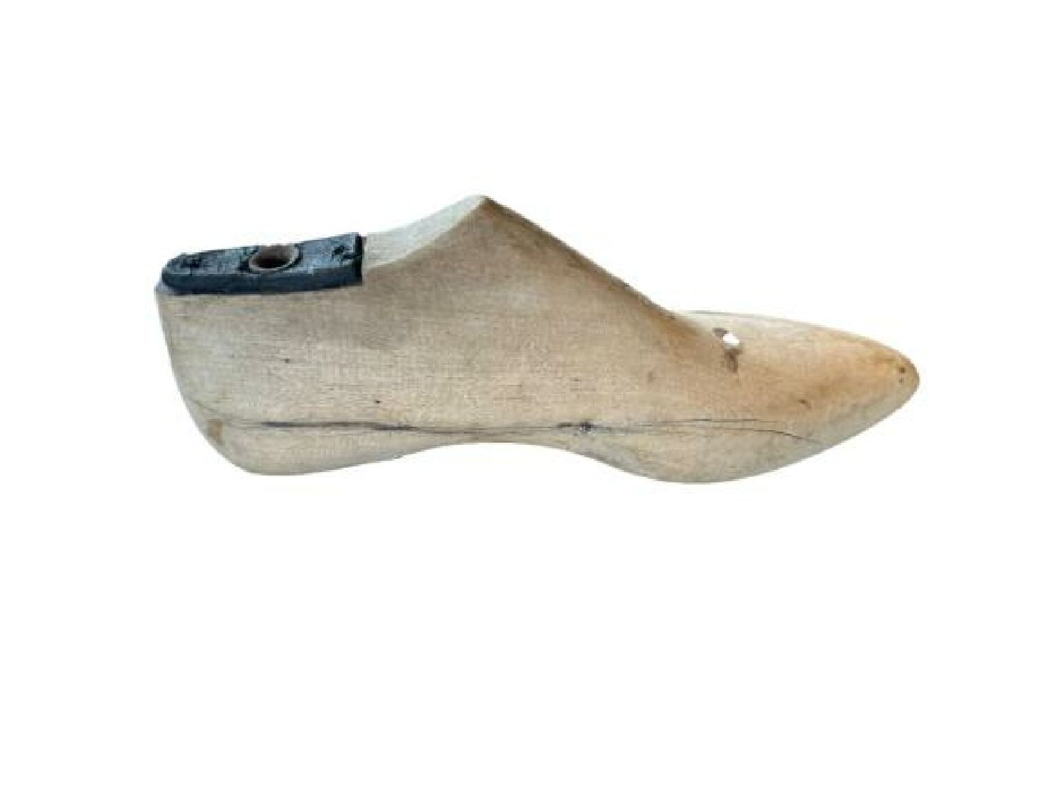 Peça rústica e charmosa confeccionada em madeira natural, representando uma forma de sapato.