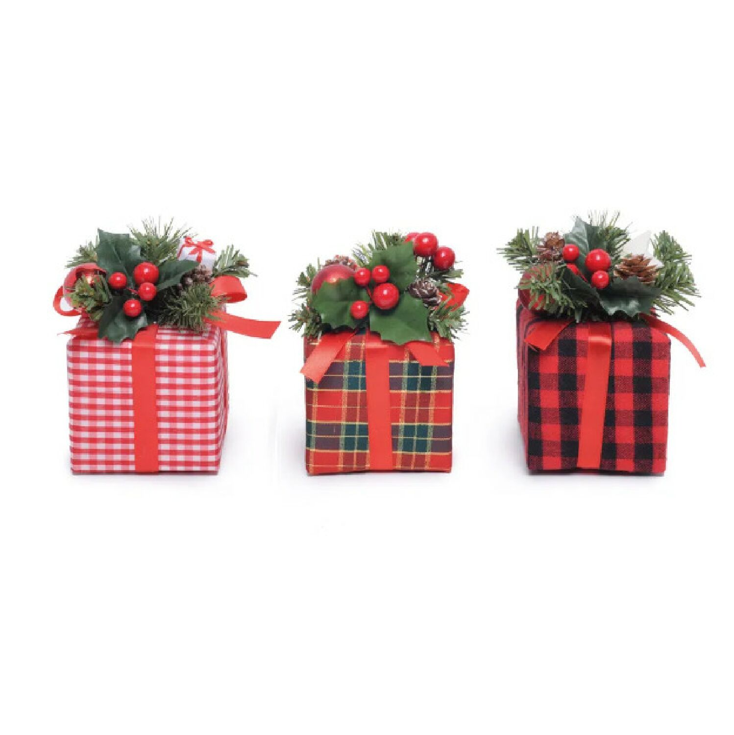 Caixa de presente decorativa unitária com estampa xadrez de cores variadas.