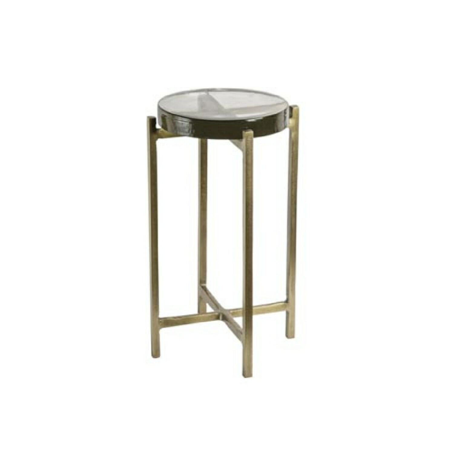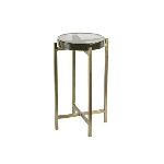 MESA DE APOIO PEQUENA DE ALUMINIO, COM ACABAMENTO BRONZE E METAL C/ TOPO DE VIDRO.