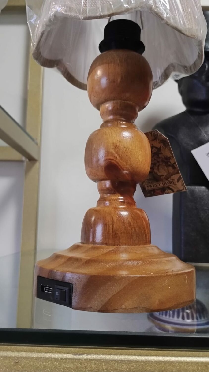 BASE ABAJUR LED MADEIRA PP BOLINHA NATURAL COM USB PARA RECARREGAR.