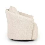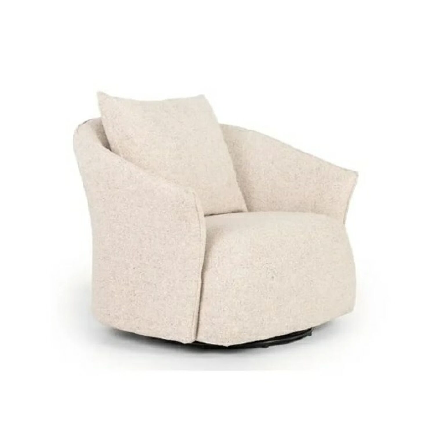 Assento fixo com costura em pesponto simples. Encosto e braços fixos com costura em fole. Almofada decorativa solta com costura em fole com base giratória.