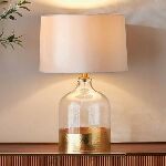 Ilumine com sofisticação e elegância! Com uma base em vidro delicadamente martelado e metal dourado, combinada à uma lindíssima cúpula de tecido, este abajur dará um toque especial e intimista à sua decoração.