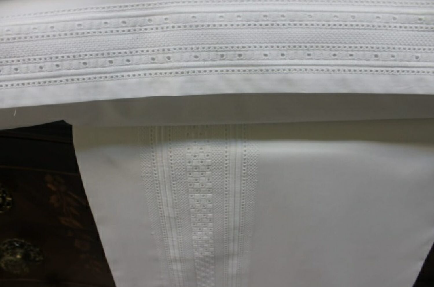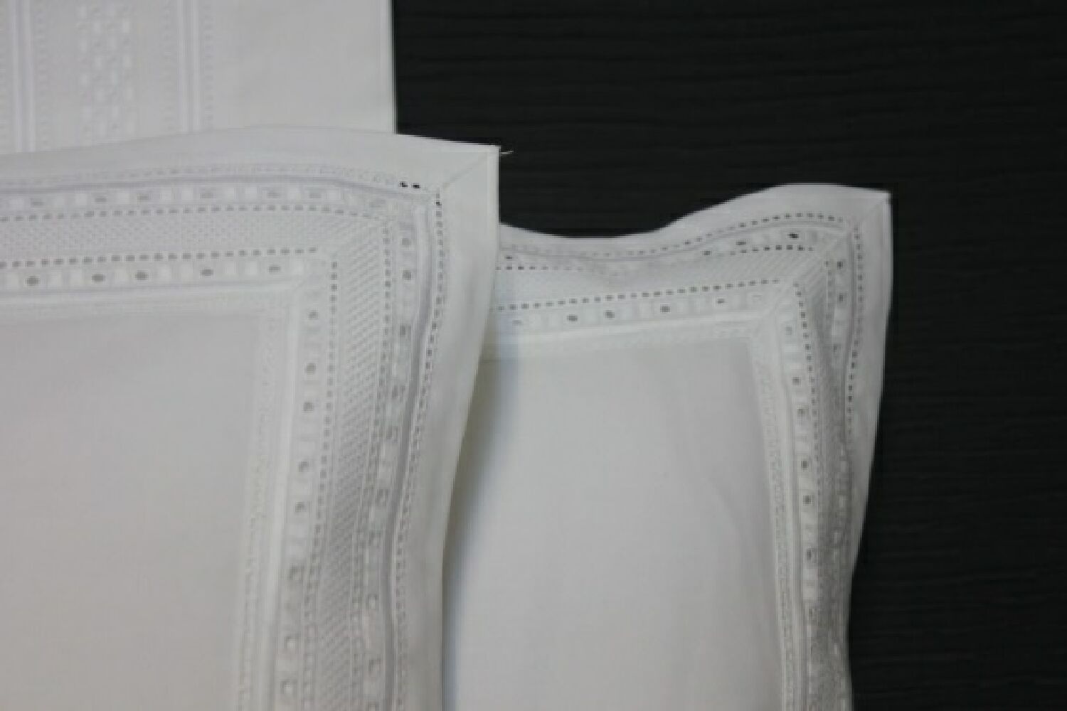 Bordados clássicos na vida do sobrelençol e nas abas das fronhas enobrecem ainda mais este jogo de beleza única.