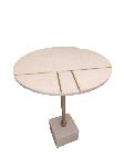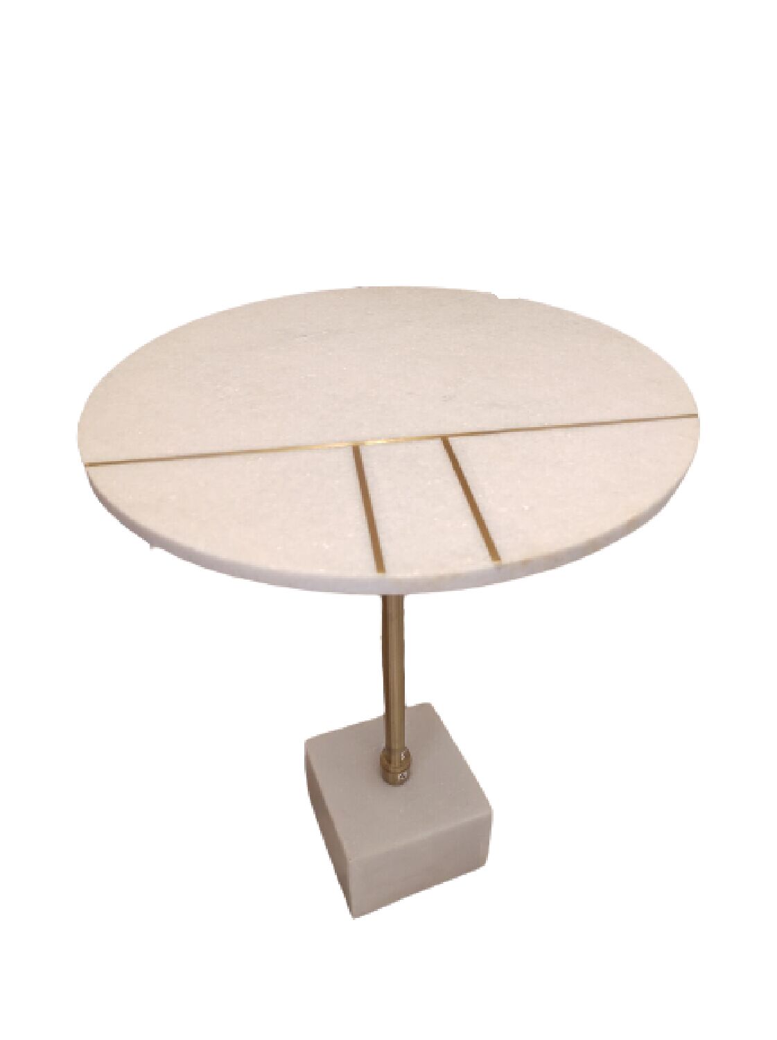 A mesa redonda tem a base em metal na cor dourado e a tampa em mámore branco.