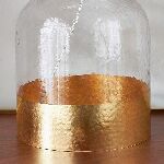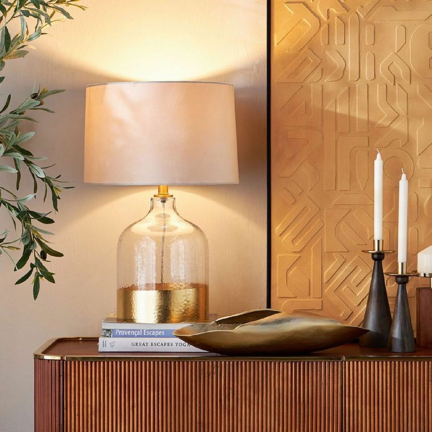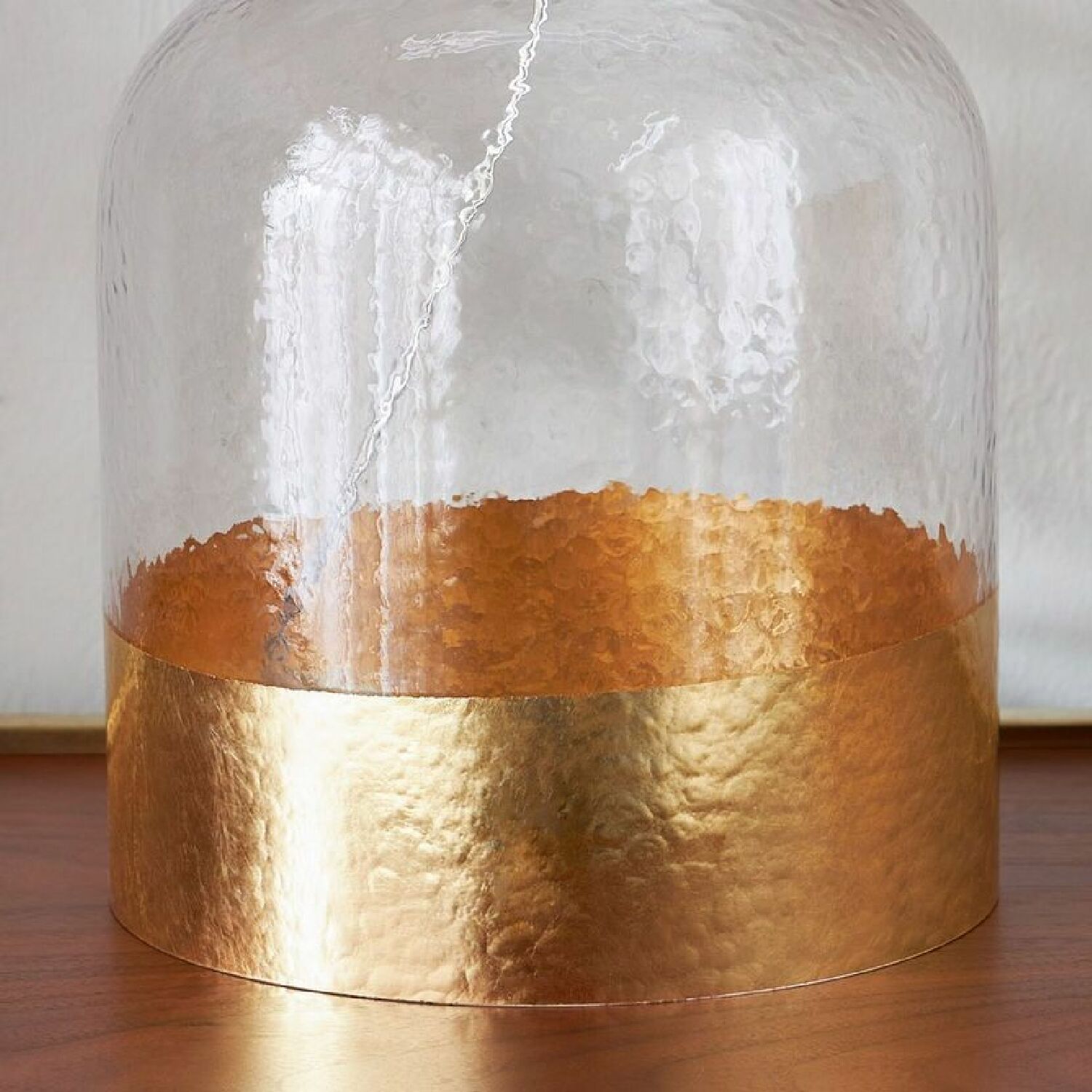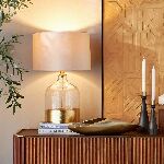 Abajur com estrutura de metal e vidro, cúpula de tecido.