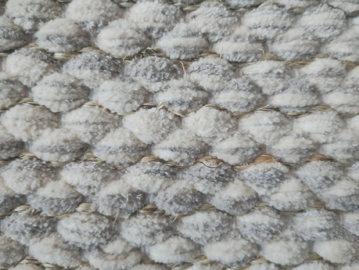 Tapete artesanal confeccionado em tear manual em chenile cru e sisal polar. Tapete sofisticado e muito confortável.