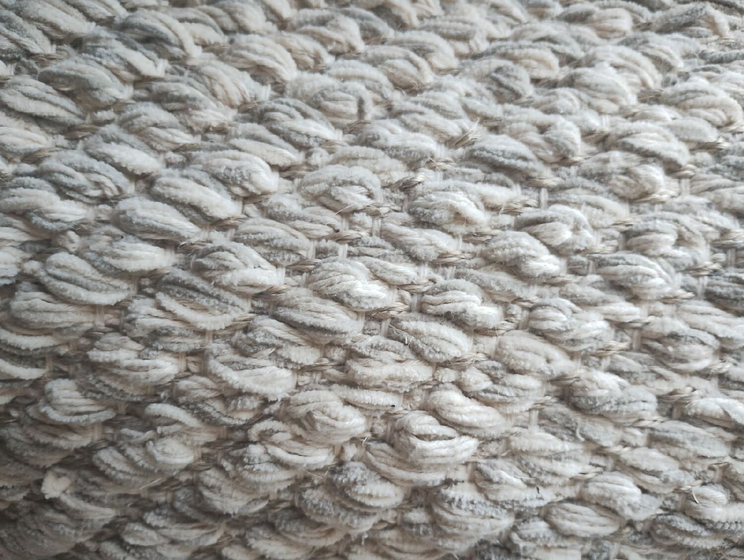 Tapete artesanal confeccionado em tear manual em chenile cru e sisal polar. Tapete sofisticado e muito confortável.