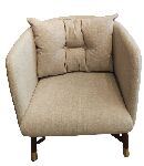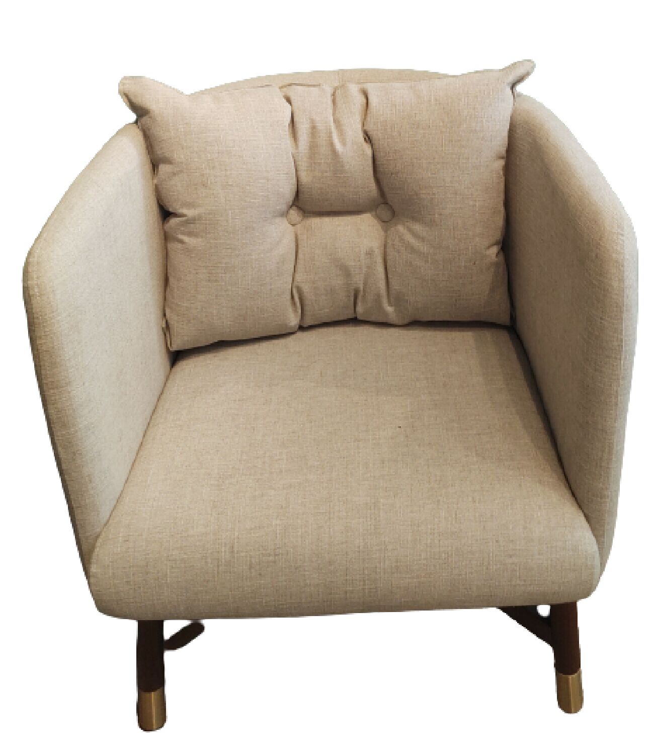 A poltrona Sher tem os pés em madeira na cor marrom e seu tecido é na cor cru.