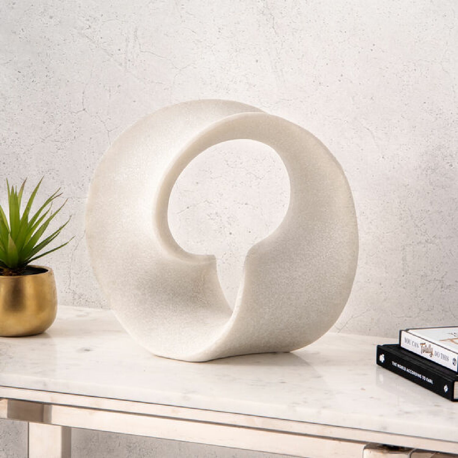 Ideal para decorar prateleiras, mesas de centro ou qualquer outro espaço, esta escultura minimalista é uma expressão artística que complementa diversos estilos de decoração. Adicione um toque contemporâneo e elegante à sua casa com esta escultura decorativa.