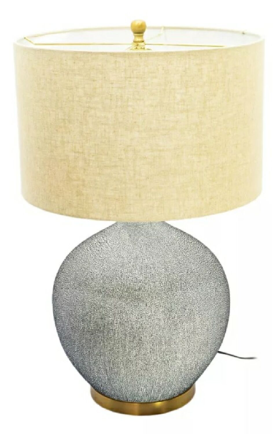 Abajur redondo na cor cinza com base em metal dourado fino e cúpula redonda em tecido na cor bege.