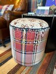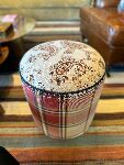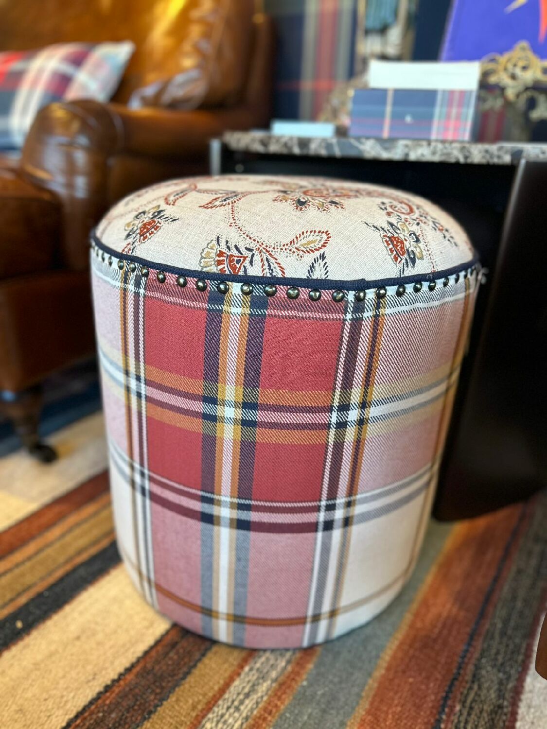 Ele possui formato cilíndrico e é revestico com tecido estampado em padronagem xadrez nas laterais. A parte superior contrasta com um tecido floral delicado em tons quentes.
