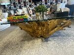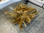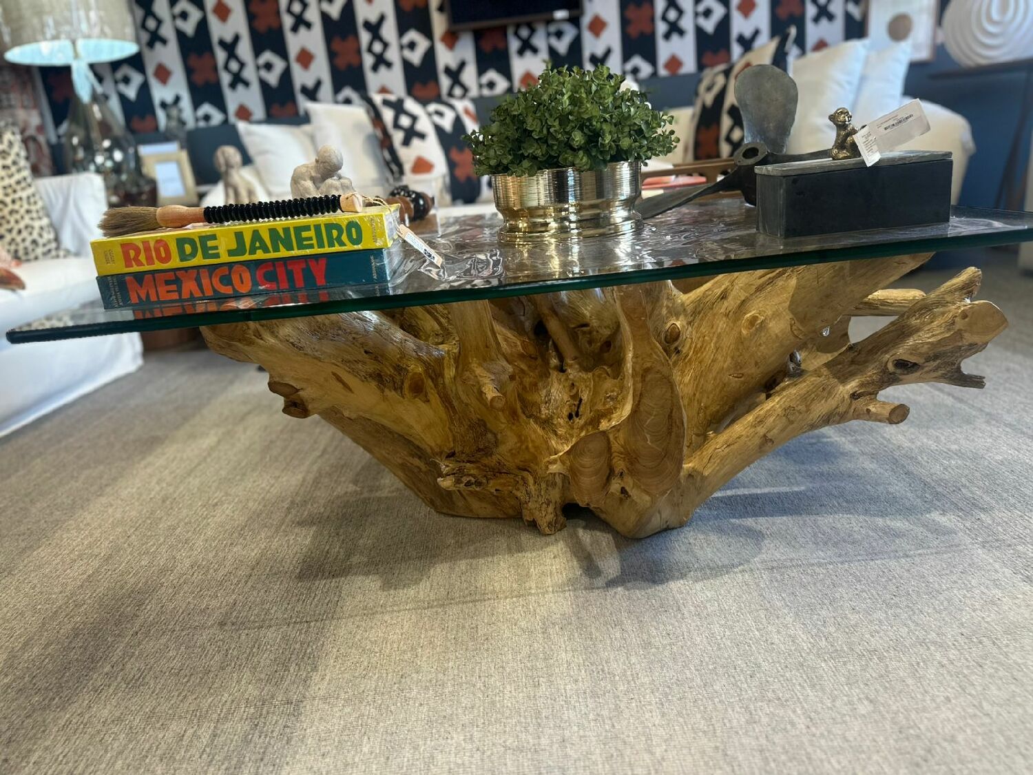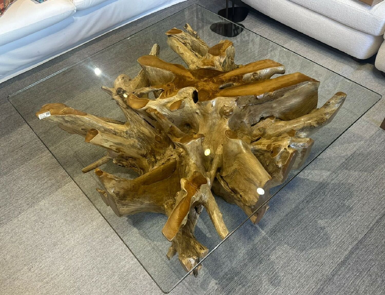 Sobre essa base escultural tem um tampo de vidro quadrado, que proporciona equilibrio visual e funcionalidade, permitindo a apreciação total da raiz como obra de arte.