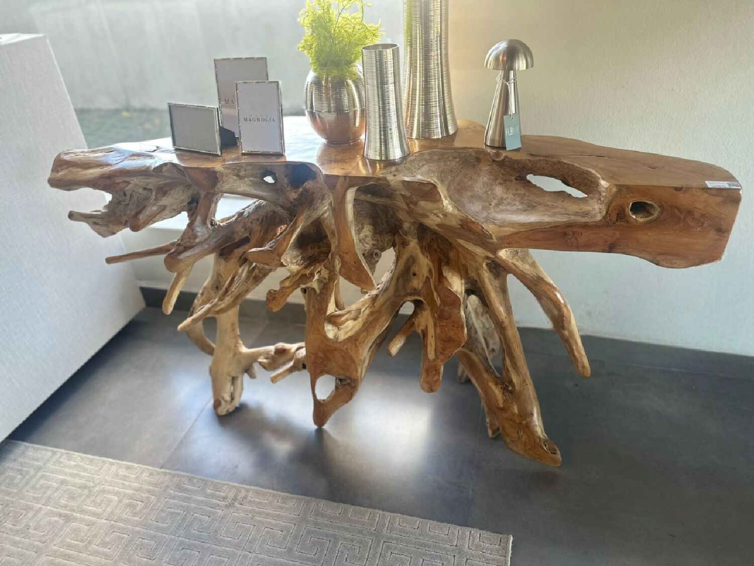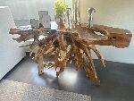 Esse aparador é uma peça escultural feita apartir de uma raiz de madeira natural, cuidadosamente preservada para manter suas formas e ramificações autênticas.