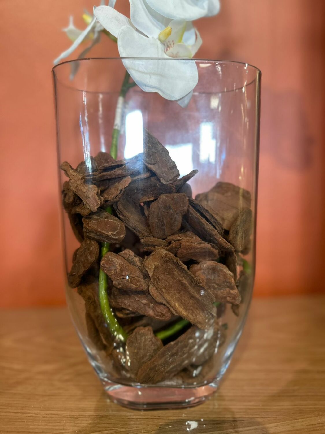 Esse vaso em vidro é uma peça decorativa de design simples e elegante. Ele possui formato cilíndrico levemente afunilado na base, com linhas limpas e transparência total, o que permite valorizar os elementos internos utilizados na composição, como pedras, cascas ou flores.