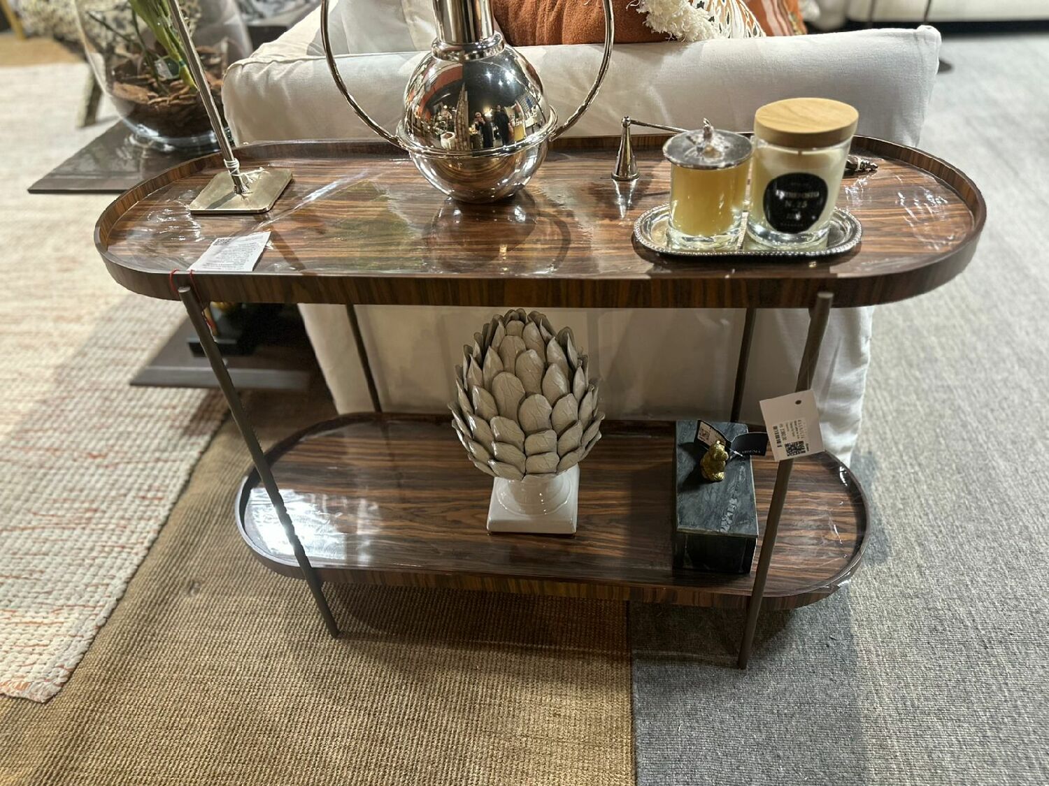 Possui dois níveis — o tampo superior e uma prateleira inferior — permitindo organização e disposição de objetos decorativos.