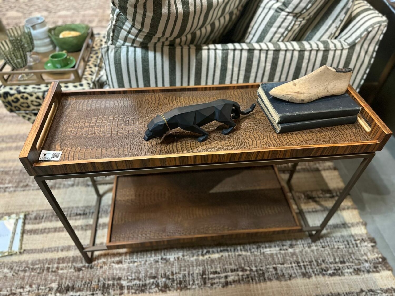 -Tampo: Revestido com material texturizado que imita couro ou pele animal, com um padrão semelhante à pele de crocodilo. A borda elevada, em madeira com veios marcados, funciona como bandeja, ajudando a manter objetos no lugar.