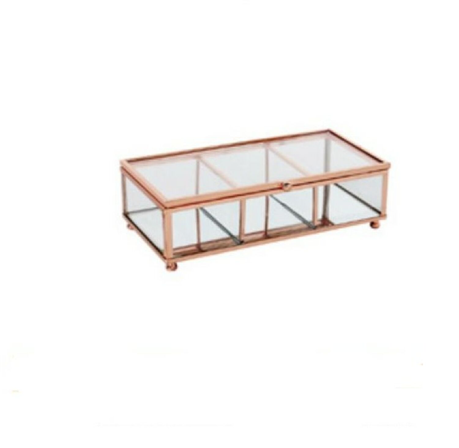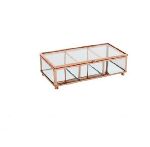 Este elegante porta-objetos une o charme do vidro transparente com a sofisticação da estrutura metálica na cor cobre.