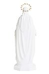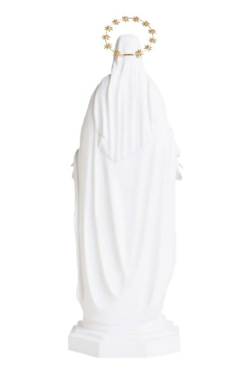A Virgem Maria é retratada em sua clássica postura de braços abertos, símbolo de acolhimento e proteção. Um detalhe marcante é a auréola dourada com 12 estrelas, que remete ao versículo do Apocalipse 12:1. "uma mulher vestida de sol, com a lua debaixo dos pés, e uma coroa de doze estrelas sobre a cabeça".