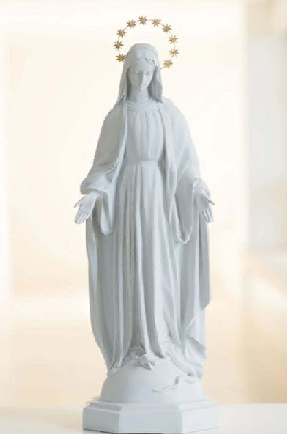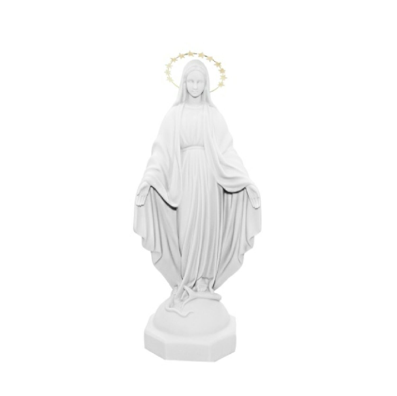 Esta imponente imagem de Nossa Senhora das Graças, com 52 cm de altura, é uma expressão sublime de fé, devoção e elegância. Reconhecida pela excelência em artigos religiosos, a peça é moldada em resina branca fosca de alta qualidade, com acabamento fino e traços delicados.