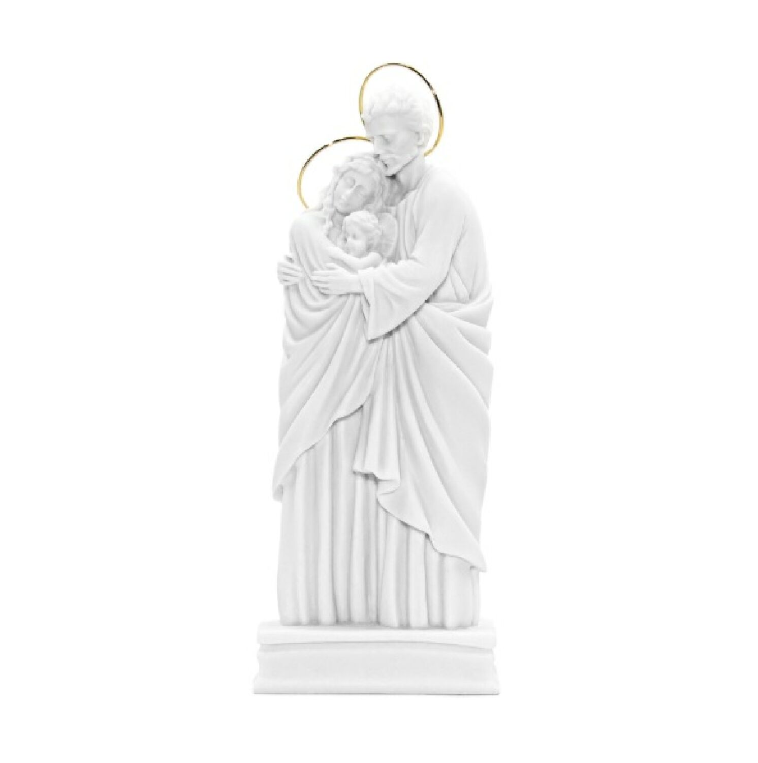 A imagem da Sagrada Família é uma peça tocante e cheia de simbolismo cristão, representando a união de Maria, José e o Menino Jesus num abraço afetuoso. Com 27 cm de altura, esta escultura em resina branca fosca transmite pureza, amor familiar e espiritualidade, sendo ideal para quem deseja expressar a fé no seio da família.