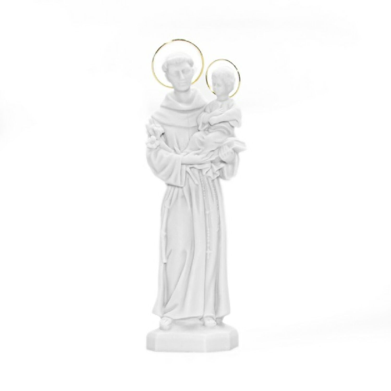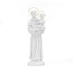 Esta imagem de Santo Antônio de Lisboa (ou de Pádua) segurando o Menino Jesus é uma peça devocional carregada de simbolismo e ternura. Com 25 cm de altura, a escultura é produzida em resina branca fosca, com acabamento refinado e auréolas metálicas douradas que destacam a santidade e o brilho espiritual da figura.
