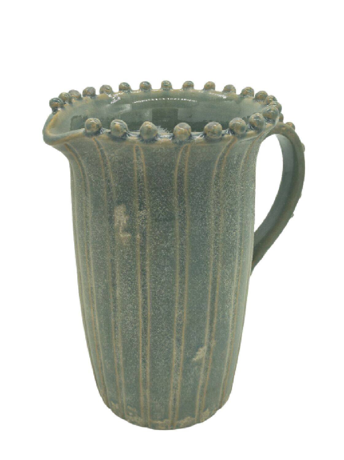 A jarra decorativa tem as medidas 24 x 17 x 26cm, fica perfeito na combinção de sua casa é em cerâmica com detalhes em bolinha na cor verde.