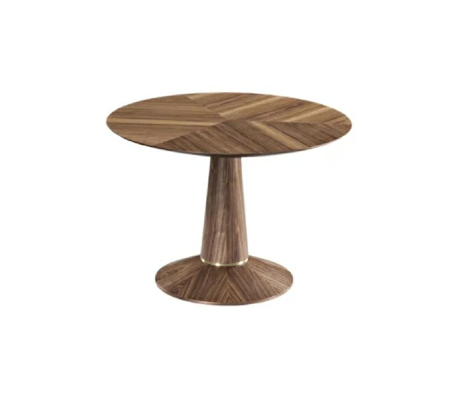- Acabamento em lâmina natural de madeira: O tampo e a base possuem paginação em espinha de peixe (ou radial), criando um visual elegante e artesanal, com veios marcantes e simetria natural.