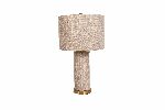 Abajur com base revestida em linhão e detalhes em metal dourado. Acompanha cúpula em tecido.
