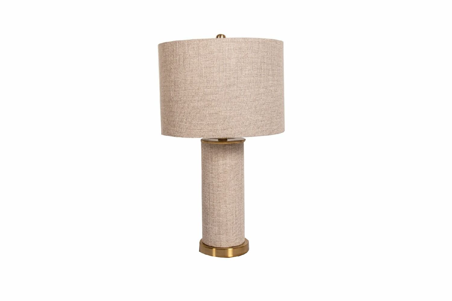Abajur decorativo de design sofisticado, com base e estrutura em latão dourado escovado e corpo revestido em tecido linhão, o mesmo material utilizado na confecção da cúpula.