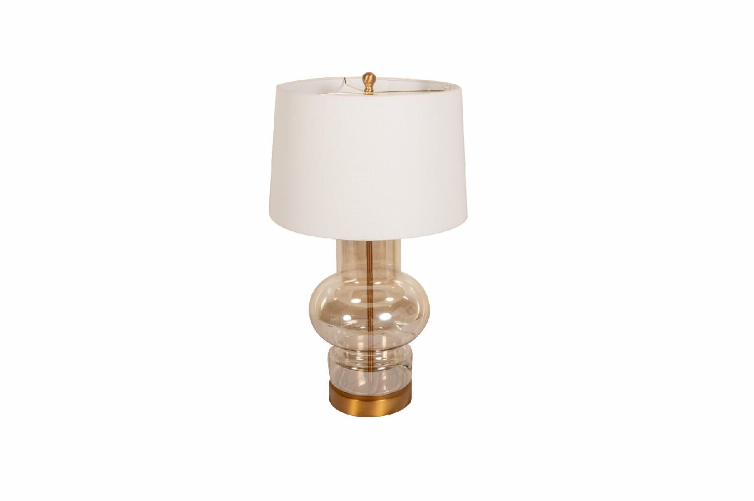 Abajur com base em vidro e metal dourado com cúpula de tecido.