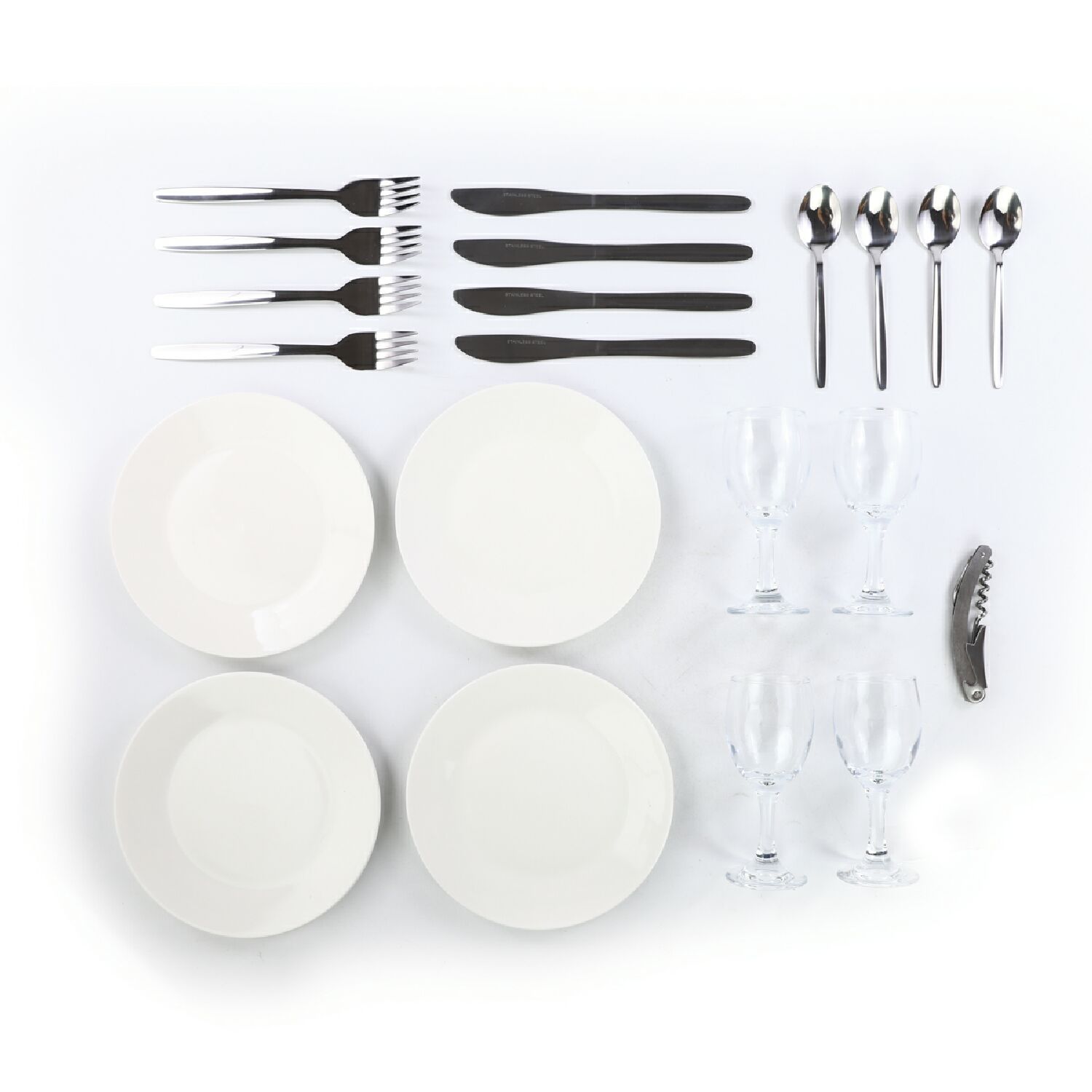 - Equipamento Incluído: 4 garfos, 4 facas, 4 colheres, 4 taças de vinho, 4 pratos de cerâmica, 1 saca-rolhas, 1 bolsa térmica fixa;