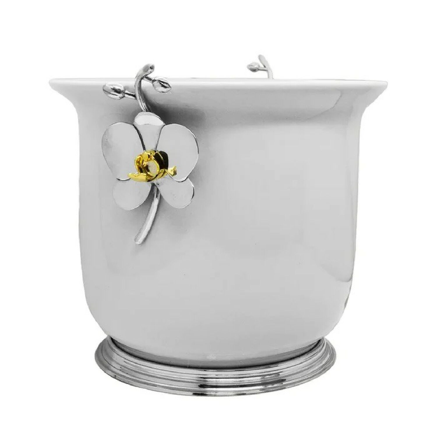 Perfeito para manter suas bebidas geladas enquanto impressiona seus convidados com um toque de luxo. Um item indispensável para quem valoriza a elegância e o requinte em todos os detalhes. Com seu design contemporâneo e o elegante detalhe da flor Orquídea banhado em ouro 24k, este balde de gelo acrescenta um toque sofisticado a qualquer ambiente.