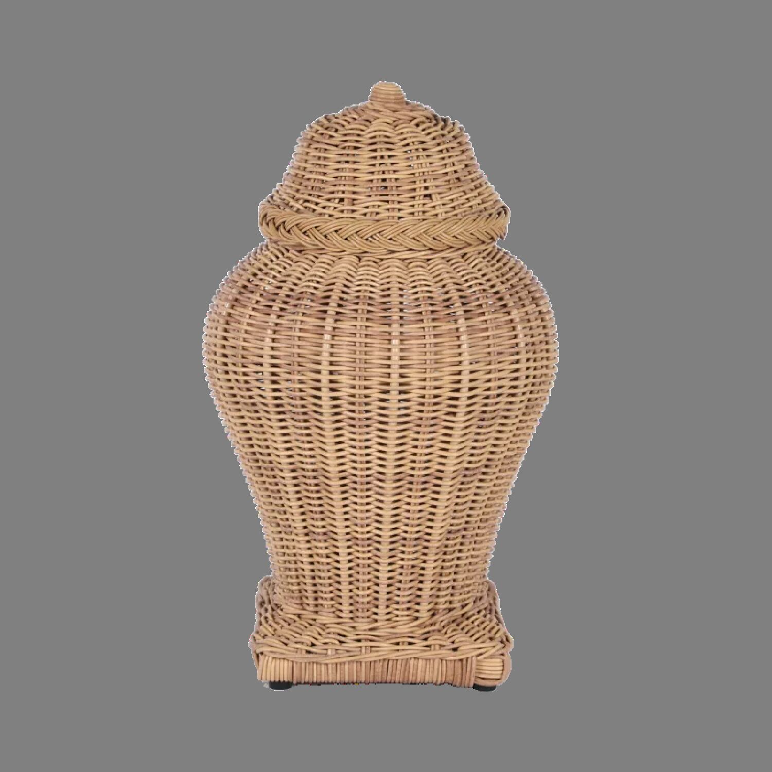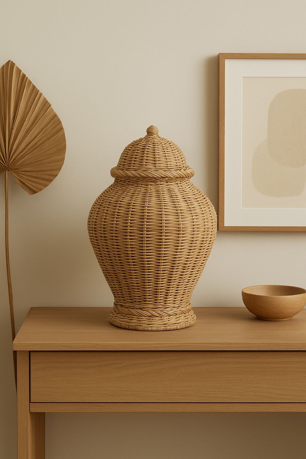 Esse elegante potiche é produzido artesanalmente em rattan natural, material que traz leveza, resistência e um charme atemporal para a decoração. Com design clássico e acabamento em trama manual, ele se destaca como peça versátil e sofisticada para diferentes ambientes. Ideal para ser usado como destaque em aparadores, racks, mesas laterais ou até mesmo no hall de entrada, proporcionando um toque acolhedor e sofisticado ao espaço. Além de sua função decorativa, o potiche com tampa também pode ser utilizado como objeto de armazenamento discreto e elegante.