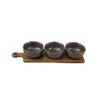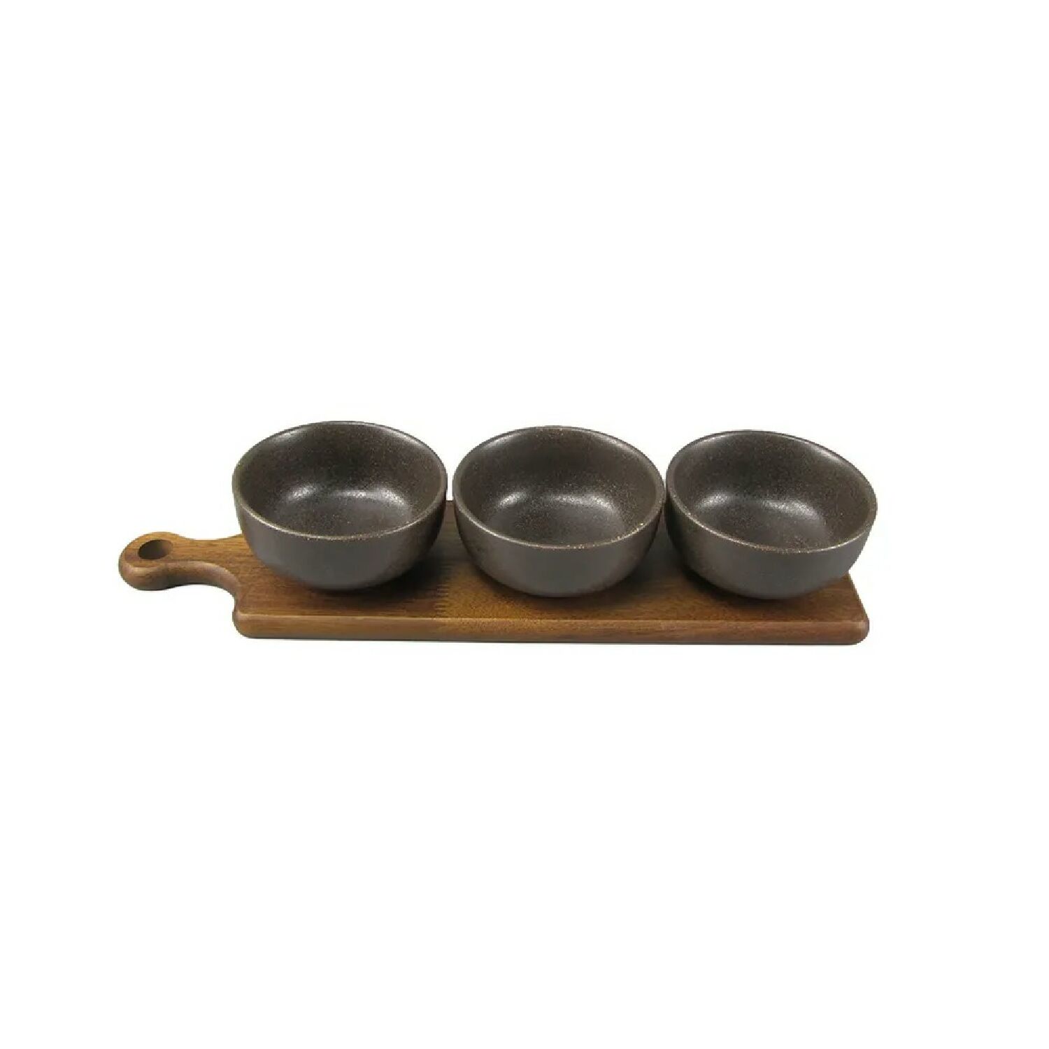 PETISQUEIRA EM CERÂMICA PRETO BANDEJA MADEIRA COM 3 BOWLS