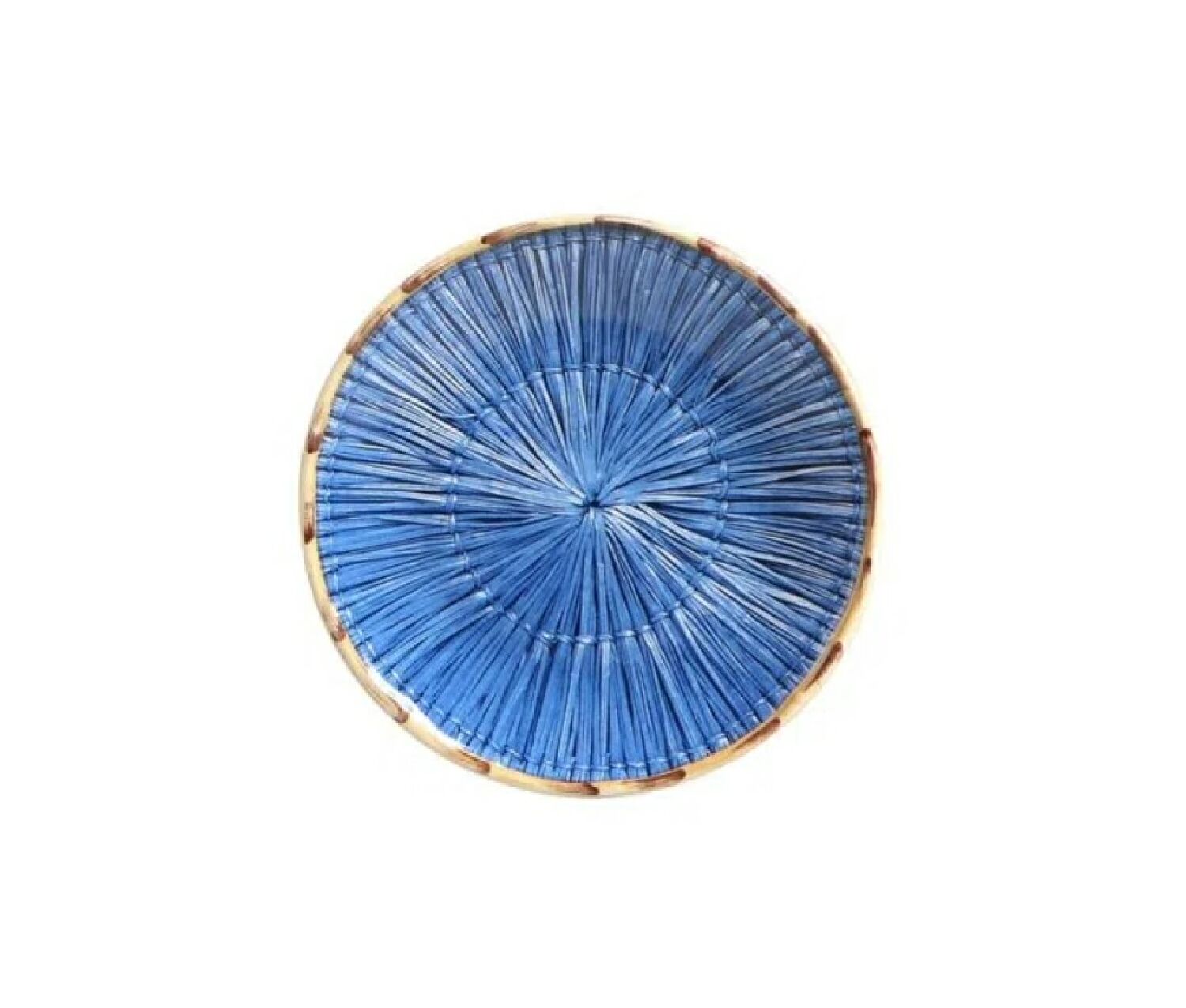 O prato de sobremesa é de porcelana com estampa em palha e borda natural.