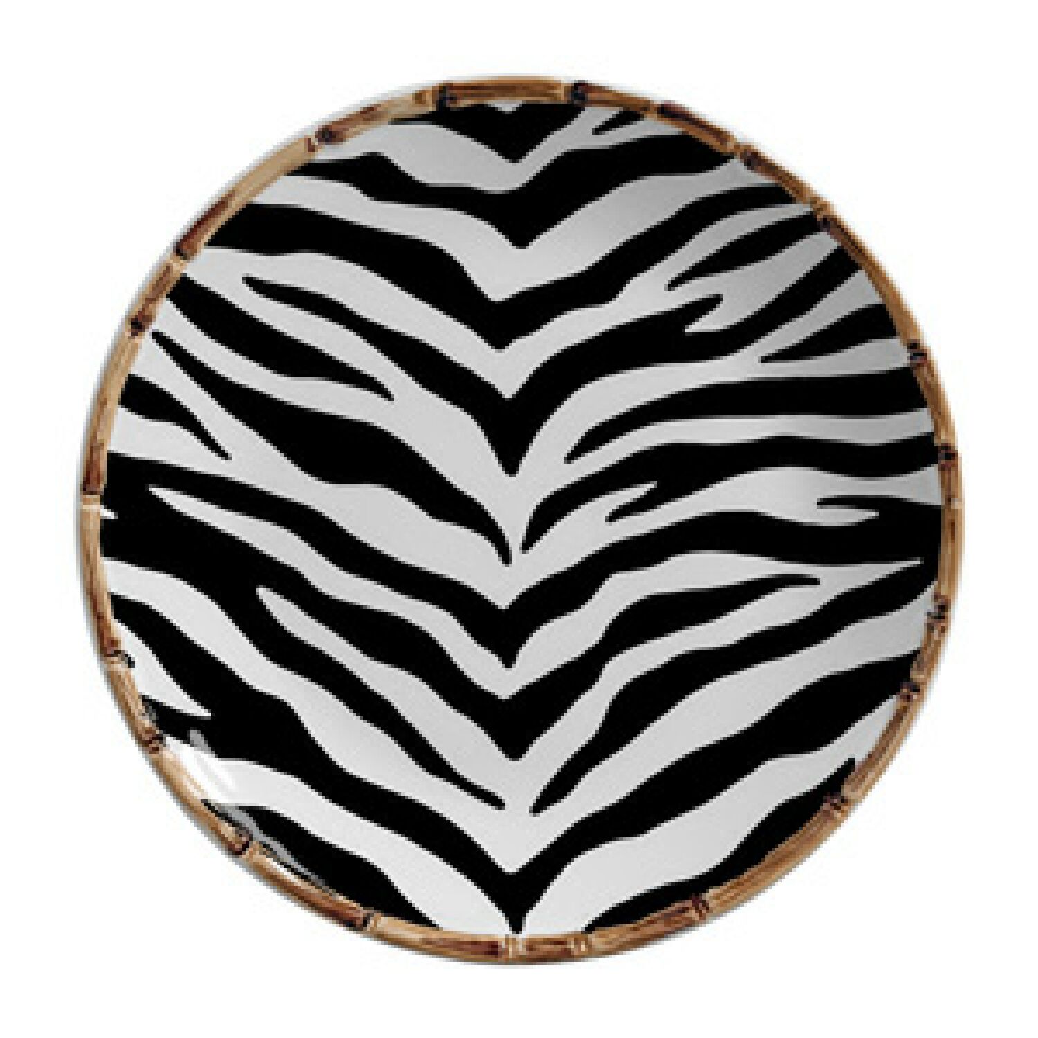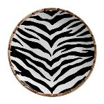 O prato de jantar é de porcelana com estampa forest em zebra e borda natural, nas cores branco, preto e natural.