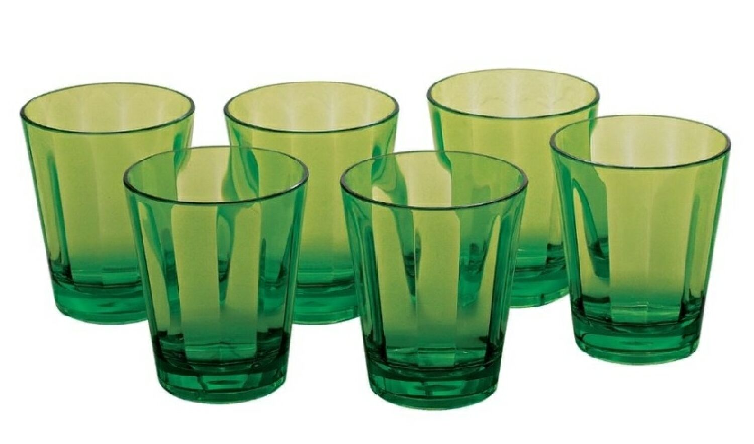 O conjunto de copos em acrílico verde é ideal para servir bebidas frescas como sucos e águas saborizadas.